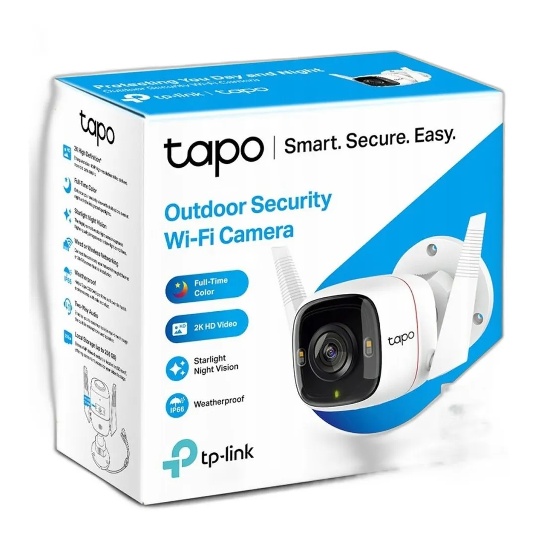 Kamera ma rozdzielczość 2304×1296, kąt widzenia 130 stopni, jest odporne na warunki atmosferyczne, ma gwarancję producenta 2 lata, a w opakowaniu znajduje się kamera, instrukcja i zasilacz.